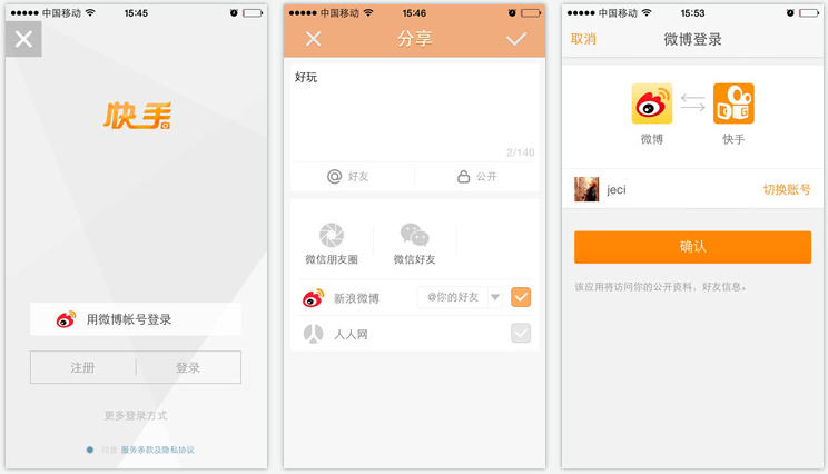 在快手的客户端中,用户通过微博登录后,发布内容可以生成一条微博,同步到微博里